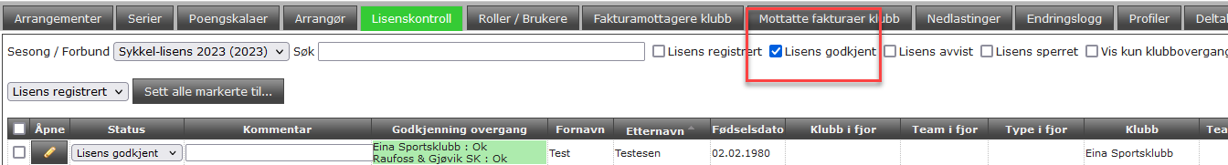 Slik kan man søke for å få opp alle i klubben med lisens godkjent.