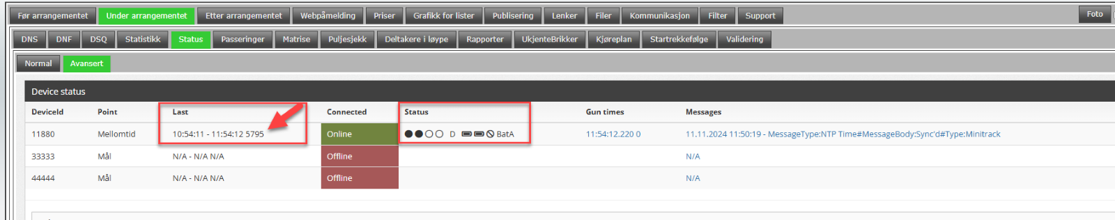 En bra måte og sjekke om Mini Track “snakker” med ditt arrangement er og trykke på Gun Start på Chrono Track maskinen, da vil man få en tidsregistrering under Gun Times kolonnen. I siste feltet ser man meldinger som Chrono Track maskinen har sendt.