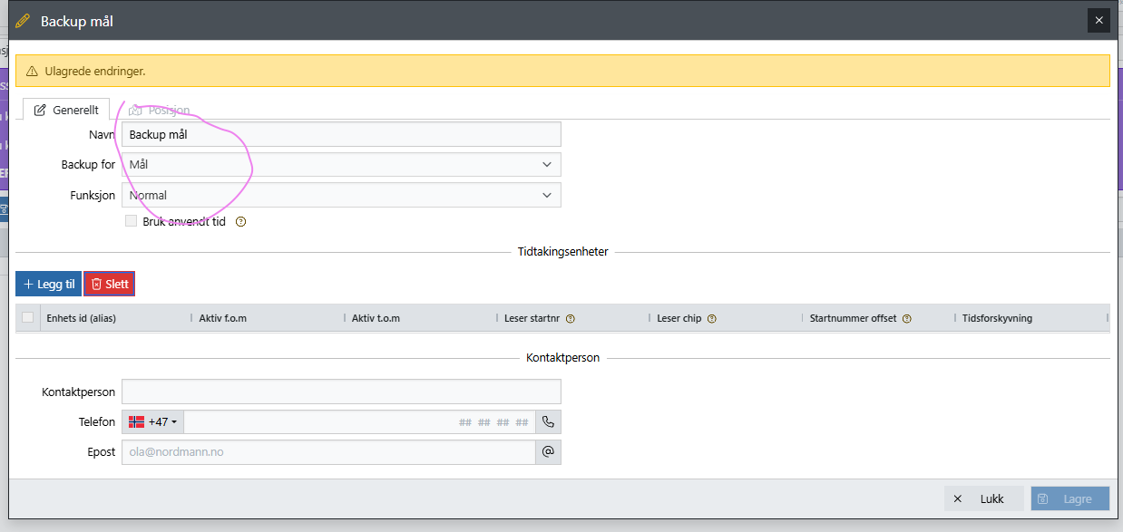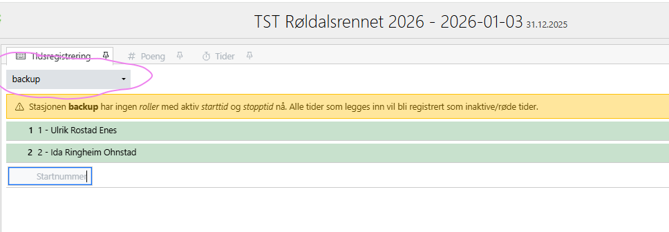Gå til stasjoner og opprett en backup stasjon for Mål. Du trenger ikke legge inn tidtakingsenhet når du skal bruke hurtigregistrering (Velg Løypeoppsett i venstremenyen og så Stasjoner og klikk på ++ ikonet)