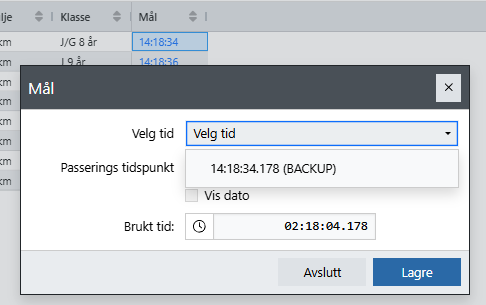 Tidene vil bli vist med blå farge under tidtaking indikering at det er backup uten at det er registrert en normal tid.