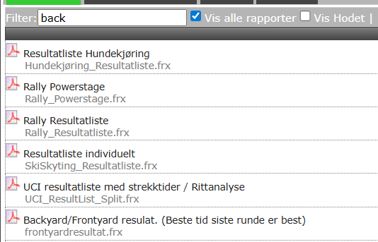 Etter løpet kan du ta ut en spesifisert resultatliste fra etter arrangementet>rapporter. Søk på backyard og kryss av for vis alle.