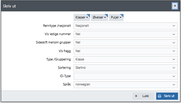 Startliste som gir mulighet for å endre sortering samt velge en id type (fiskode, uci kode etc)
