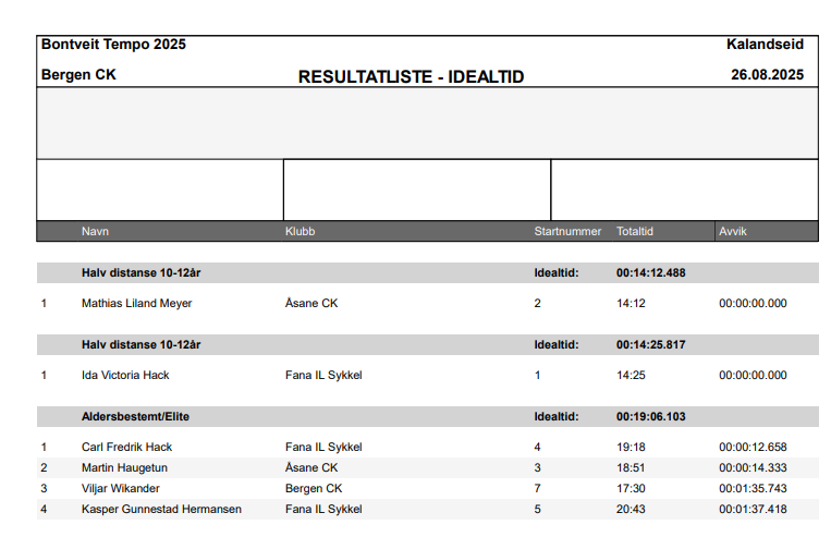 Resultaltiste for idealtid (Summen av tiden / antall deltakere)