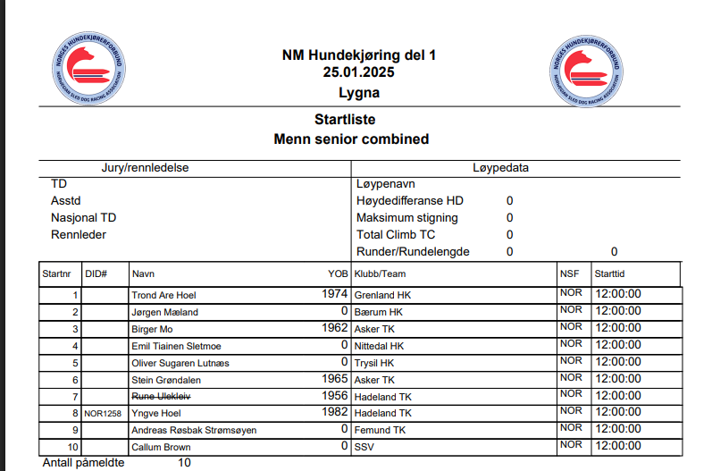 Startliste tilpasset Norges hundekjørerforbund. Tar med DID id om den finnes på utøver.