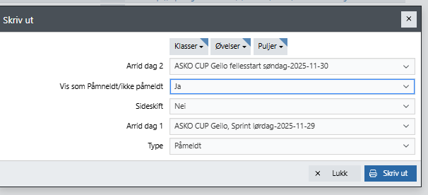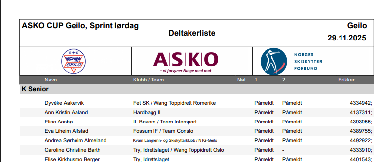 Deltaker/startliste med 2 dager. Du kan velge å vise påmeldingsstatus, startnummer eller seeding.