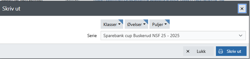 Du må velge hvilken serie det skal oppdateres fra og du kan filtrere på Øvelser, Klasser og puljer om det bare er deler av serien som skal oppdateres. Serier til samme forbund som aktuelt arrangement samt alle serier til arrangøren er tilgjengelig
