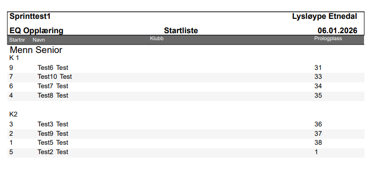 Lager startliste for heat i en sprint . Grupperes per klasse og heat.  Prologplassering vises for sporvalg.