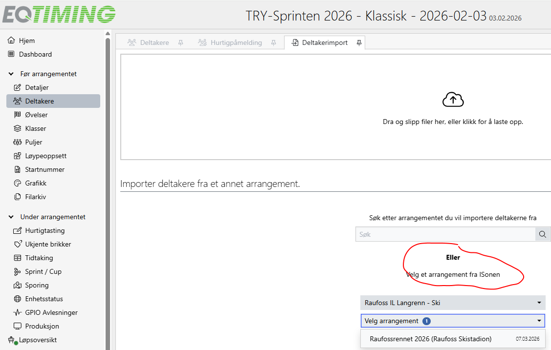 Normalt vil en hente deltakere fra Isonen ved å velge Isonen når en velger Opprett arrangement. Dersom man ønsker å benytte oppsett fra tidligere renn kan en istedenfor opprette arrangementet ved å velge Fra et tidligere arrangement og så bruke deltakerimport for å hente deltakere fra isonen.