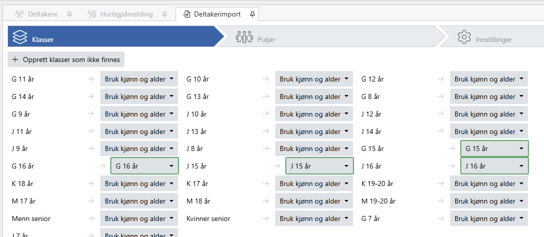Klikk bekreft og du kommer til skjermbilde for å koble klassene i isonen med klassene i arrangementet.