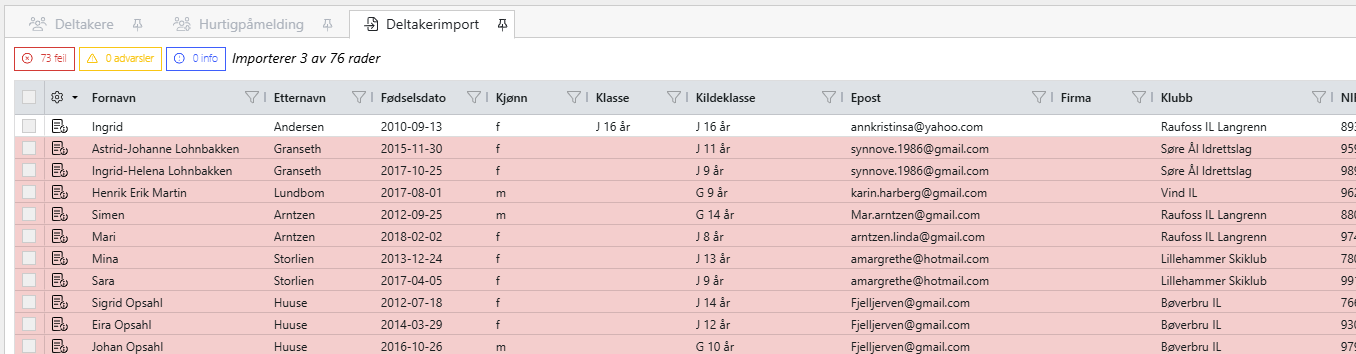 Siste bilde er en grid med oversikt over hva som importeres. Scroll helt til høyre for å se feilmedlinger på røde linjer.