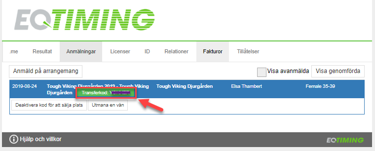 Om du önskar att avaktivera transfer-koden så kan du trycka på Avaktivera kod för att sälja plats.
