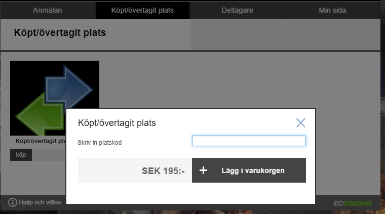 Uppge den transfer-koden som du fått från deltagaren som sålt sin plats till dig